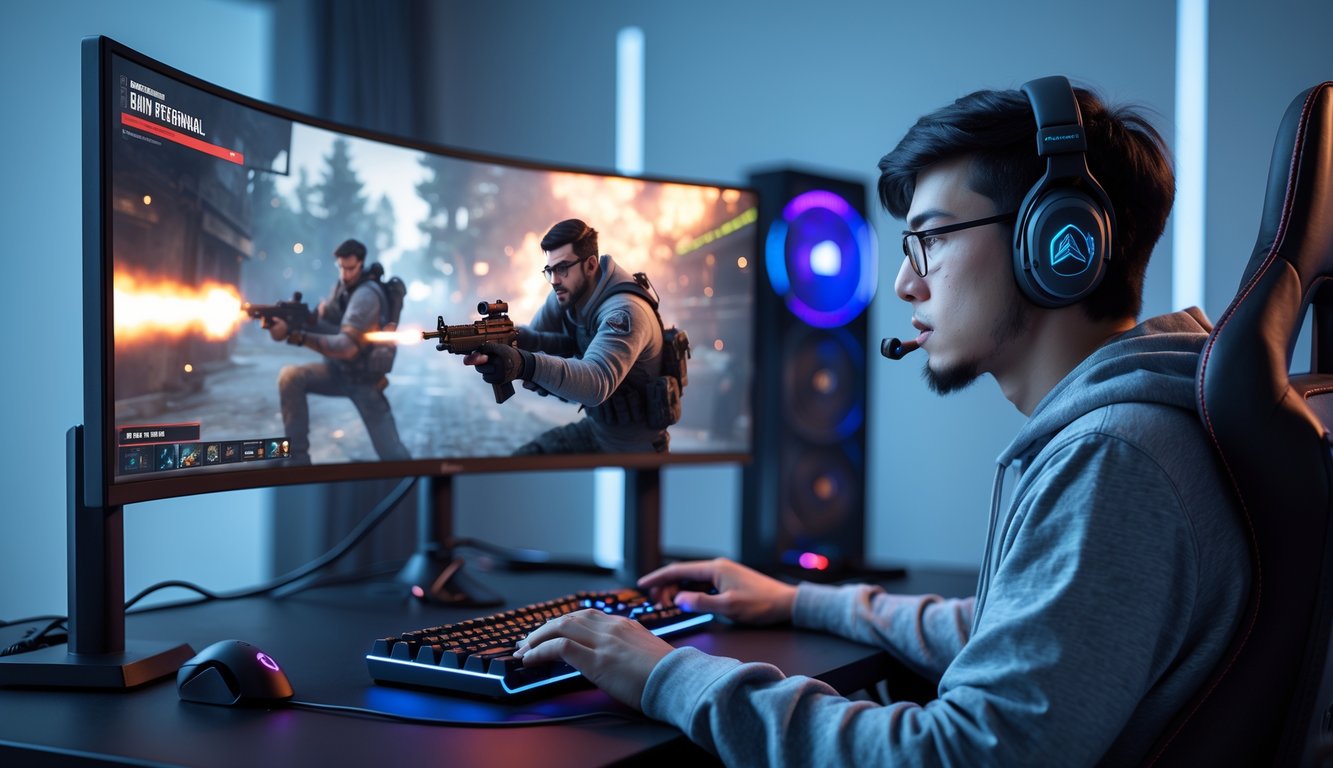 Seorang pemain muda fokus bermain game FPS kompetitif di depan monitor besar dengan perlengkapan gaming lengkap.