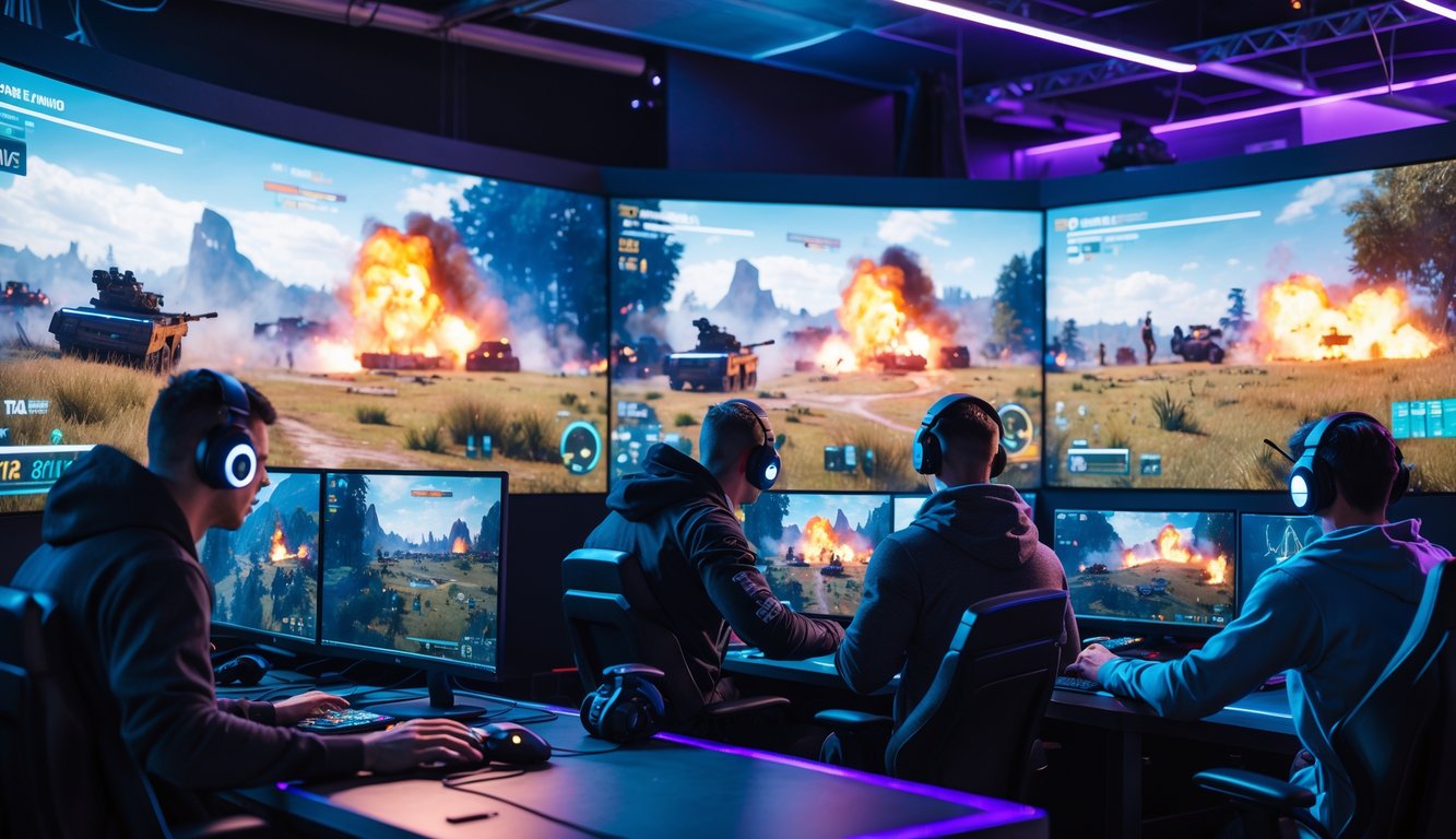 Sekelompok pemain game sedang bermain permainan FPS battle royale dengan fokus dan antusias di sebuah ruangan gaming modern.