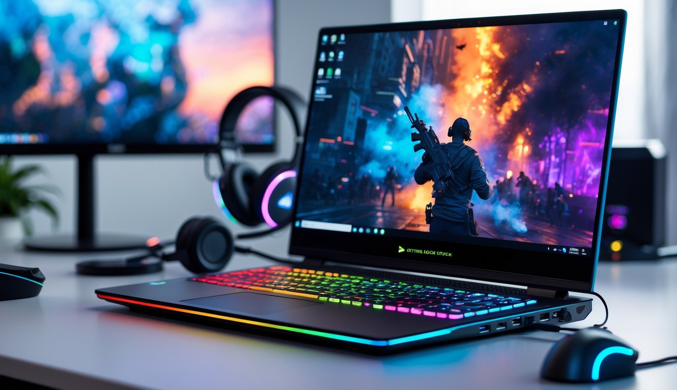 Laptop gaming dengan keyboard backlit RGB dan layar menampilkan permainan, diletakkan di atas meja bersih dengan aksesori gaming di sekitarnya.