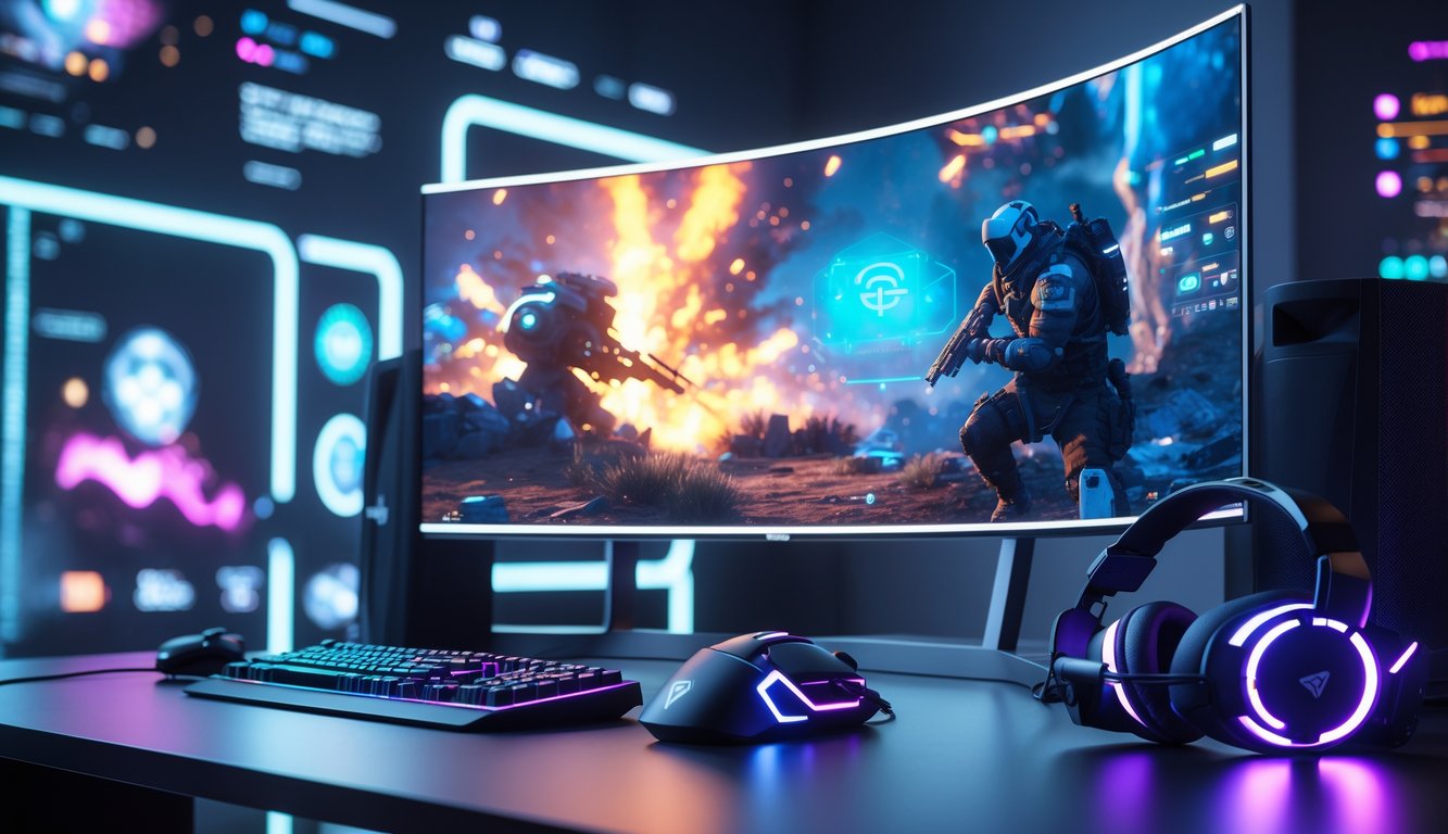 Sebuah setup gaming futuristik dengan monitor melengkung besar, keyboard RGB, mouse gaming, dan headset VR di atas meja dengan pencahayaan LED berwarna-warni dan elemen holografik di latar belakang.